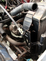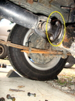 で、ちょっと学習して(笑) 前側のドライブシャフトが抜けないように、針金で固定しておく |