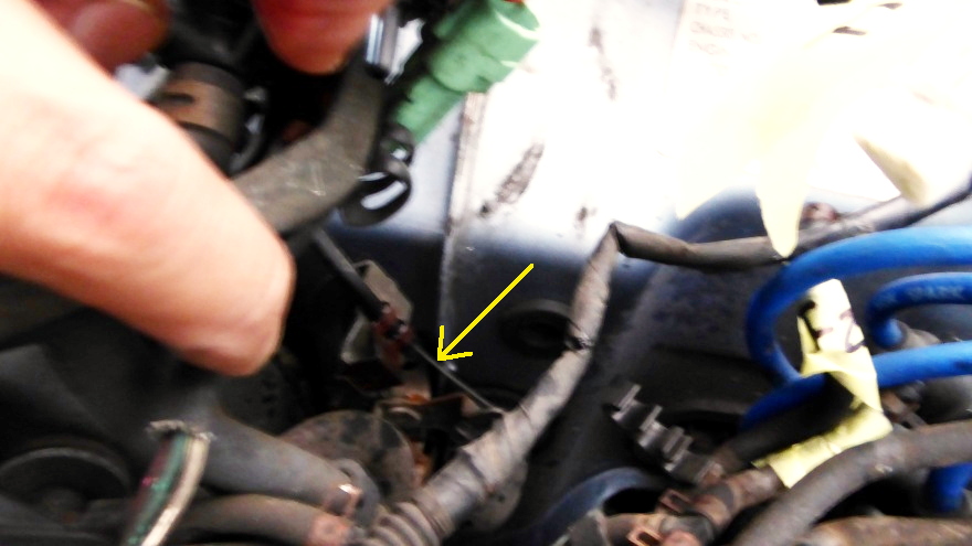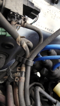 点火コイルの下側の固定ボルトに、メインハーネスの