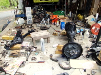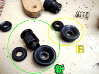 | では、リヤブレーキのOHに着手。OHキット購入済なんで、ゴムパーツは全交換。まずは右側から。 |
