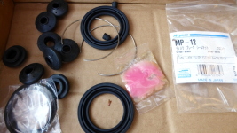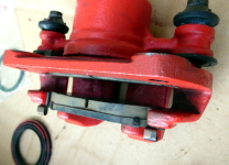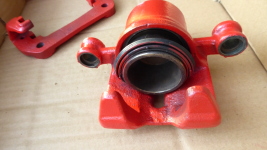 | 塗装が終わった左のブレーキキャリパーのマスキングテープと保護に入れておいた古いシールを外す。 |