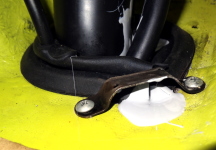 穴はノコ刃で削って少し拡大して、ブーツも切れ目入れて、金具で強引に止める事にした。 |