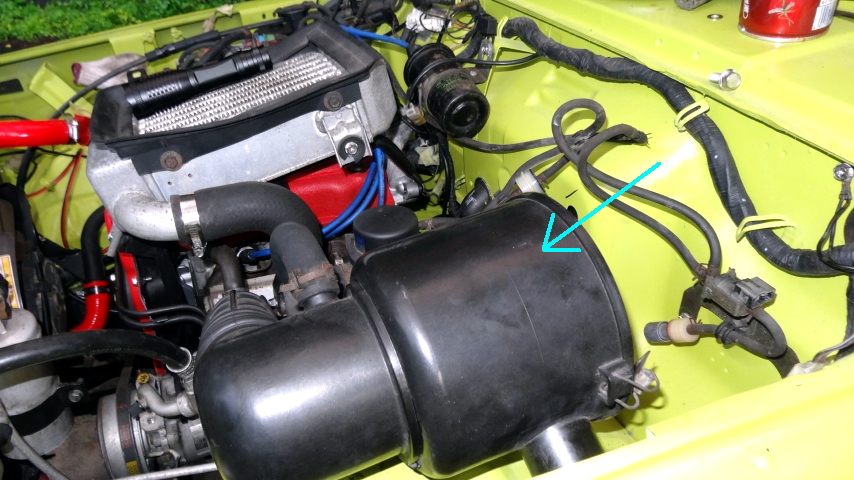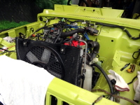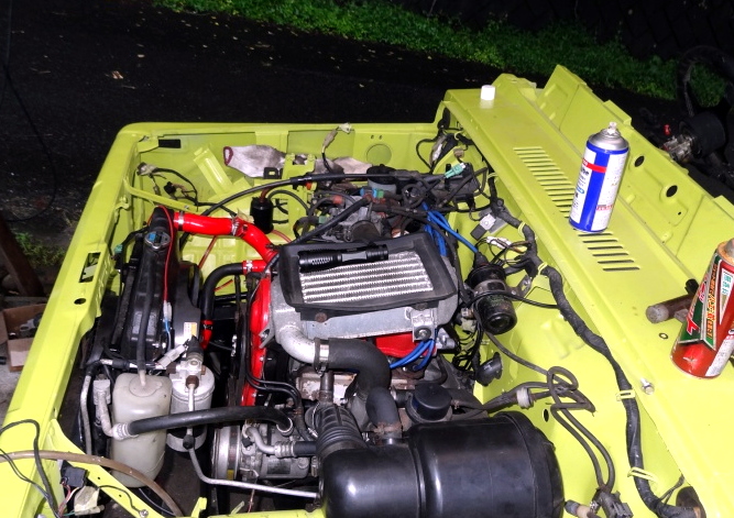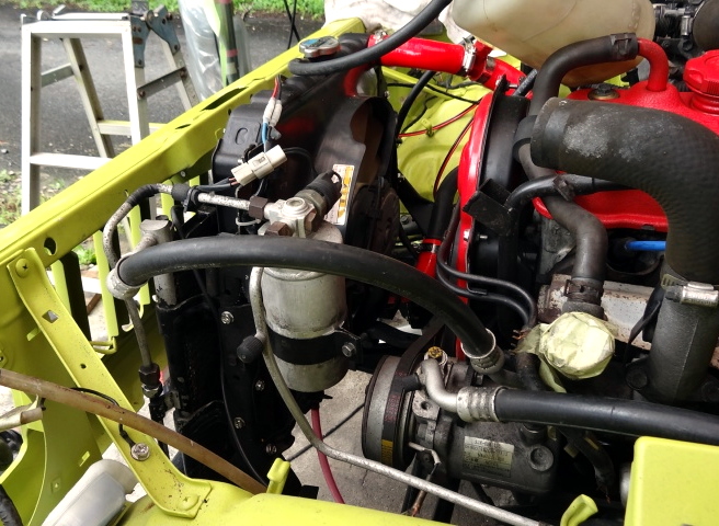 本日は、エアコンのコンデンサー・エンジンルーム内の残りの配線・配管・インタークーラー・エアクリーナーボックス等の取り付け。 |
