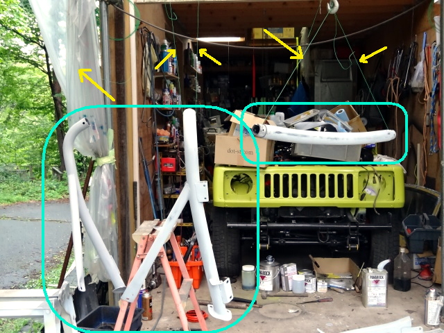 | ロールバーが塗りにくいので、上から針金で吊ったら、モビール状態(笑) |