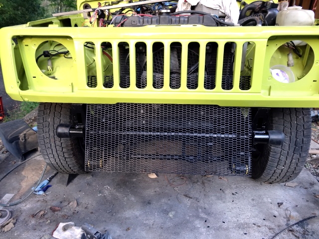 ウォッシャータンク、フロントグリル、フロントエプロンなどの取付、リヤの純正バンパーステーの切断、リヤバンパー用のステー加工など |