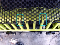 破れてる純正のグリルメッシュの替わりのABS樹脂のハニカムメッシュグリルネットをカットして付ける。 |