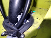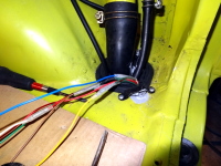 どこを通すか悩んだ結果、燃料ホースのブーツの切れ目を床下から通す事にした。