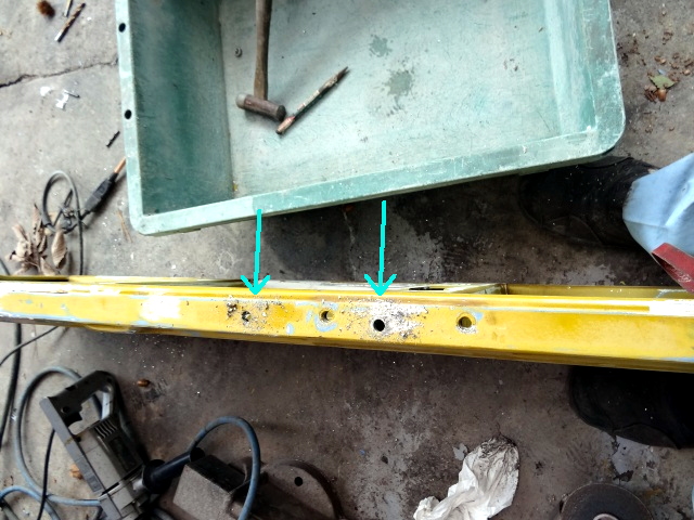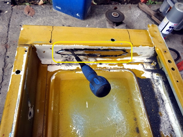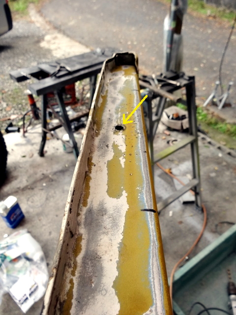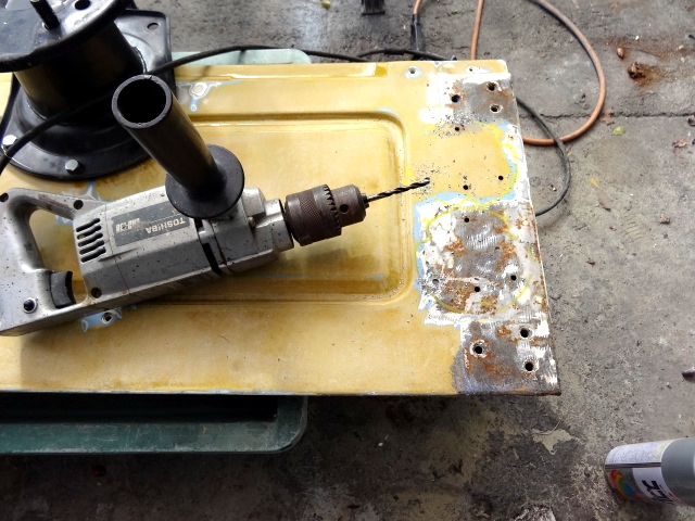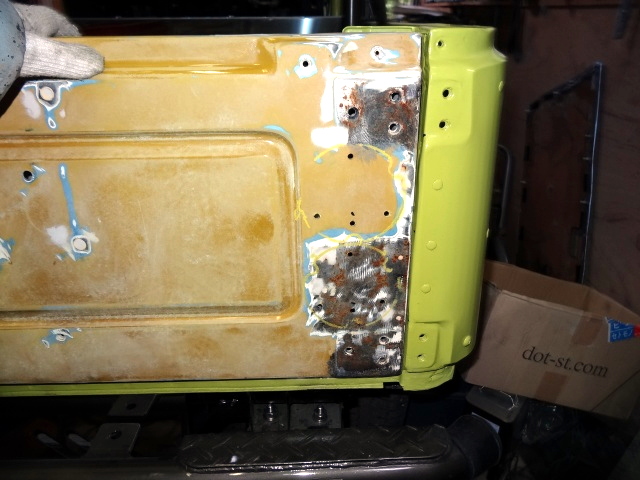 リヤゲート右側の裏で、LEDテールのナット止めたり結線しないといけないので、手の入る穴をグラインダーで開けた。 |