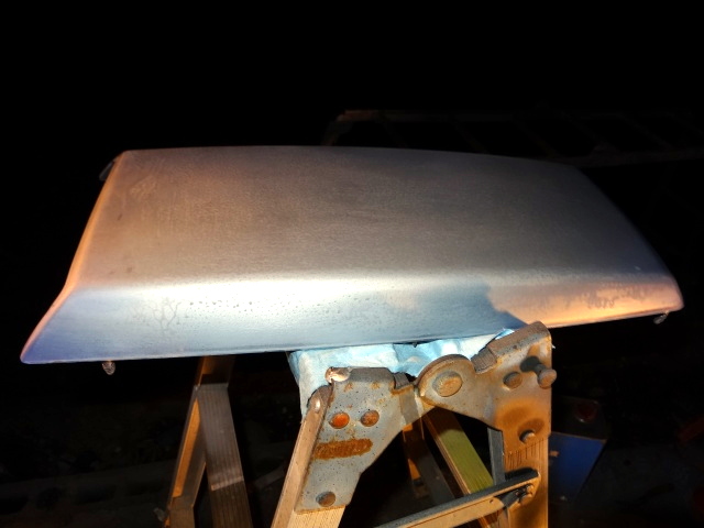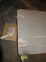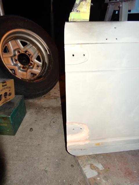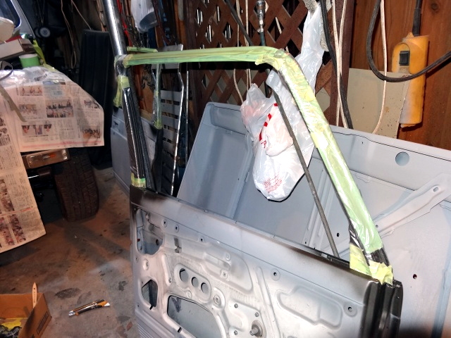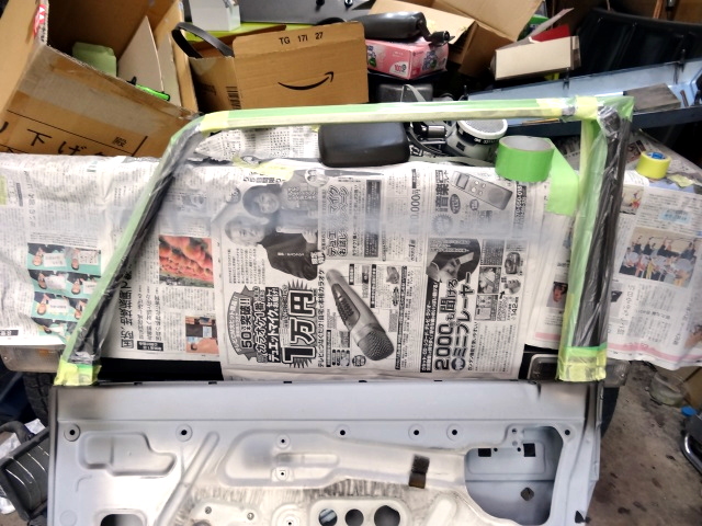 | ドア上部のガンメタに塗ったトコをマスキングし、下部の下処理、プラサフ塗装。 |
