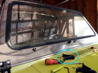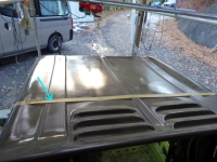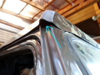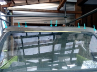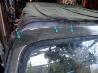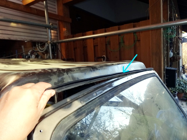 結局純正ゴムが前方の収まりが良い感じだが、上部に隙間が出来る。強雨だと抜けてきそうなので純正ゴムの上にスポンジゴムを貼る事にする。 |