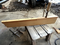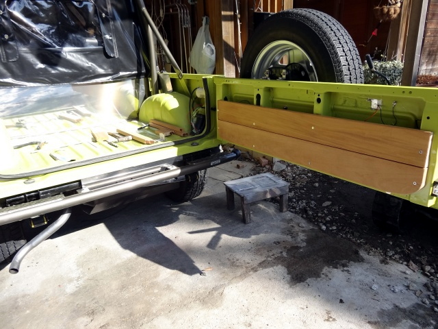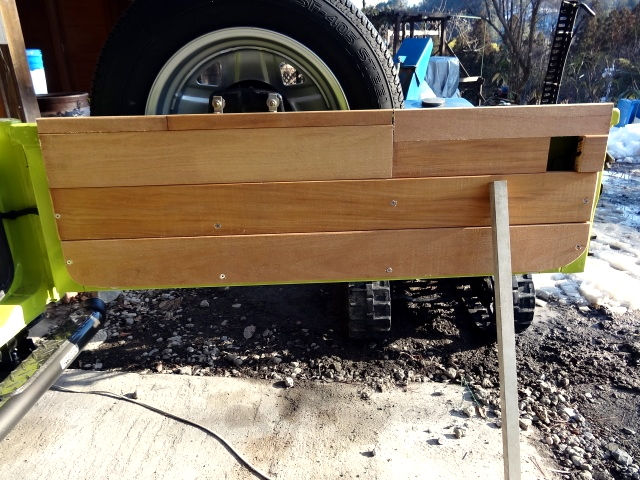 端材も使って、リヤゲート上端より1cmほど上まで板を出す仕様で、板を切り出し仮組み。 |