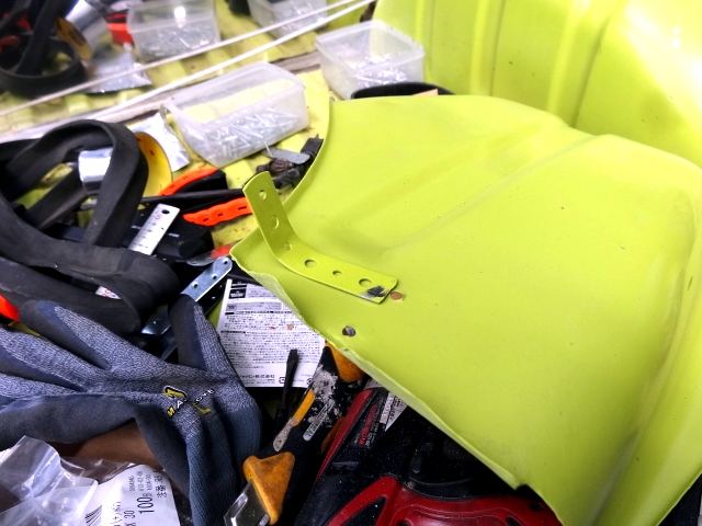 荷台右内側の板張りの前に、給油口裏のカバーの取付け。