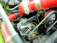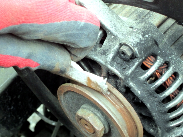 | 10/13(土) オルタネーターのプーリーの錆落とし。 9/1(土) にファンベルトを再調整したけど、電圧は、まだ低い状態の時がある。 なんかゴムの焦げ臭もあるので、ファンベルト廻りの再点検したら、再び、大量のゴムの削りカス。 よく見たら、プーリーに錆の凸凹があった このオルタネーターは、永年ガレージで眠っていたJA11エンジンの備品。 ジムニー再生でサイズアップしたんだけど、プーリーの錆までは確認してなかった。 って事で、プーリーの錆落しして、予備のファンベルトに交換する事にした。 |