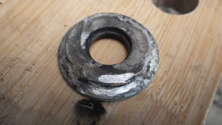 アダプターをもう少し大径にすべく色々探したら、古いジムニーのショックアブソーバー留めてた、皿型のワッシャーの平らな部分の内径が32mmで丁度のサイズだった。