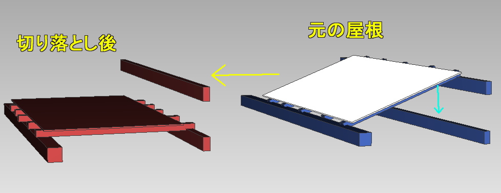 屋根を切り抜いてガレージの中間の桁の高さまで落として床として再利用する。