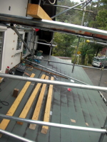 足場が悪いので、羽子板ボルト止めの穴明けも、結構大変だった。 |