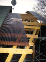 本日は、階段小屋の東側の屋根の桟の残り〜屋根張り
