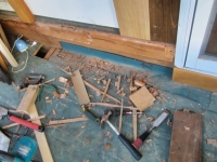 5/1(金)と2(土) 階段部屋のドア上の桁加工、ドア左側下部の床張り前の整形など