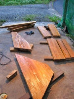 5/25,26 階段部屋の下側の3〜4段目の階段板加工、上から2〜3段目の階段板仮置き