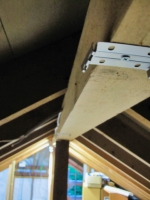 ここは、金属の筋交を避けないといけないので、根太張りに一工夫必要。 |
