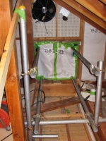 | サッシ枠の室内側の右側を分解して、足場を避けて外で再組立して、壁面に固定。 |