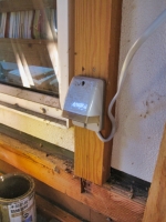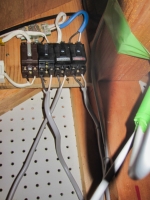北端の床張る場所に散らかってる配線を片付けで、未だに、階段部屋内の電源は、屋根裏部屋内から延長コードで伸ばしてるので、外に電源取付け。