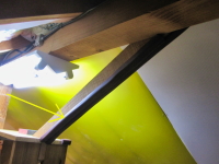 | さて、書棚8・9番の位置が決まったので、以前から良く頭をぶつけていた、屋根裏部屋入り口に近い筋交いの最終的に露出になる部分にガードクッションを付ける事にする。 |