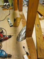 5/3〜4:中央書棚の側板の切り出し、支柱となる側板を立てながら、天板取付け