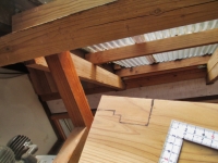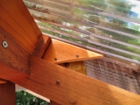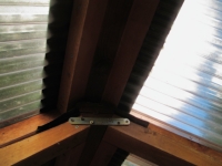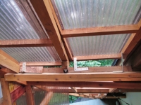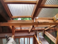 | 次は、あちこちの虫除けの隙間埋め。波板と梁等との隙間を、板やテープで埋めていく。 |