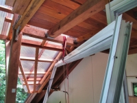 アルミサッシを仮組して、4面の位置合わせ、支柱取付、屋根の追加切断など