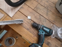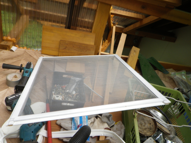 次は階段部屋の1F、ここは、外に出ないといけないので、フレーム作った網戸をドアとして取り付ける