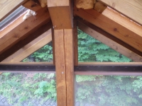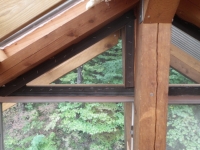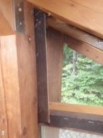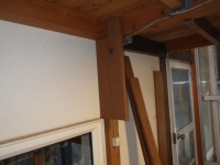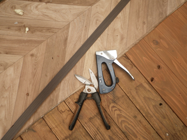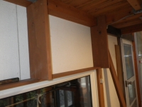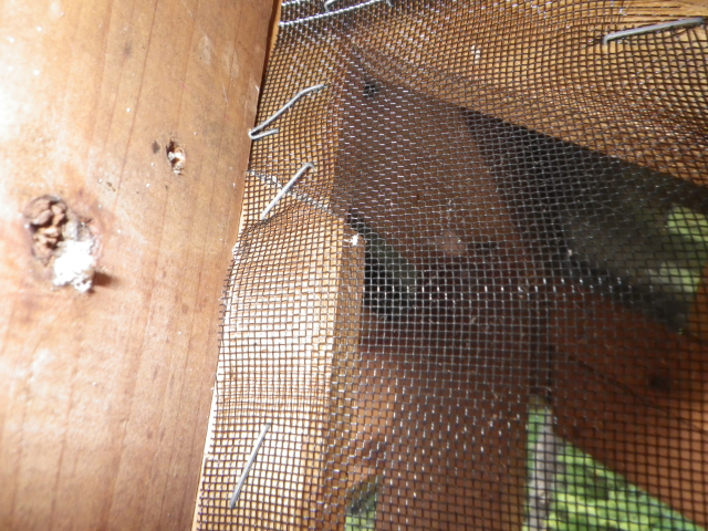 2Fの隙間を再捜索、北側の上段のサッシ上の、ネットをスタッカーで留めただけの部分の、ネットの留めが甘い部分発見したので、上から2mm厚ほどの化粧材の端材を切って、上から更にスタッカー留め |