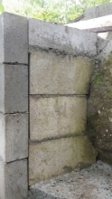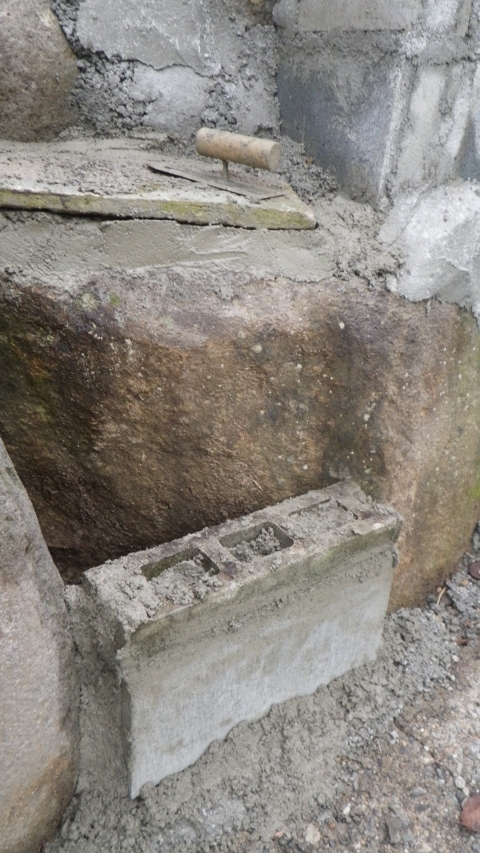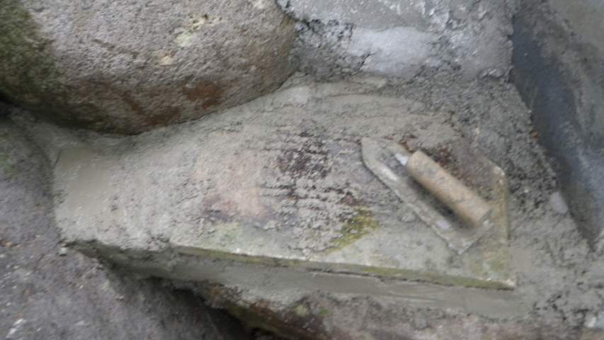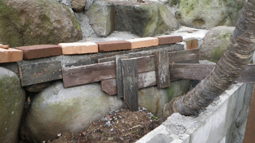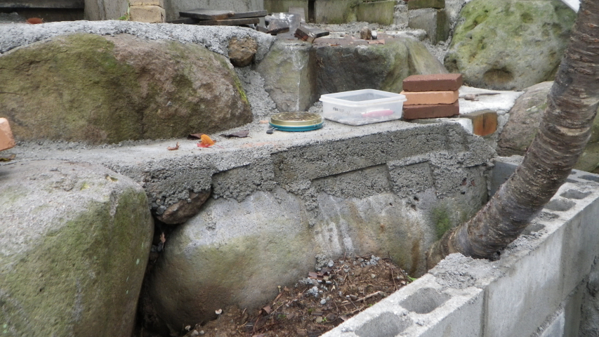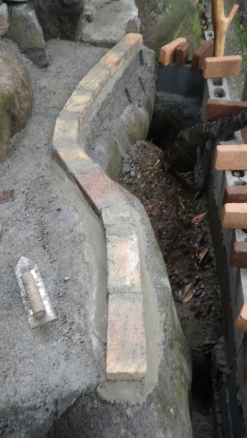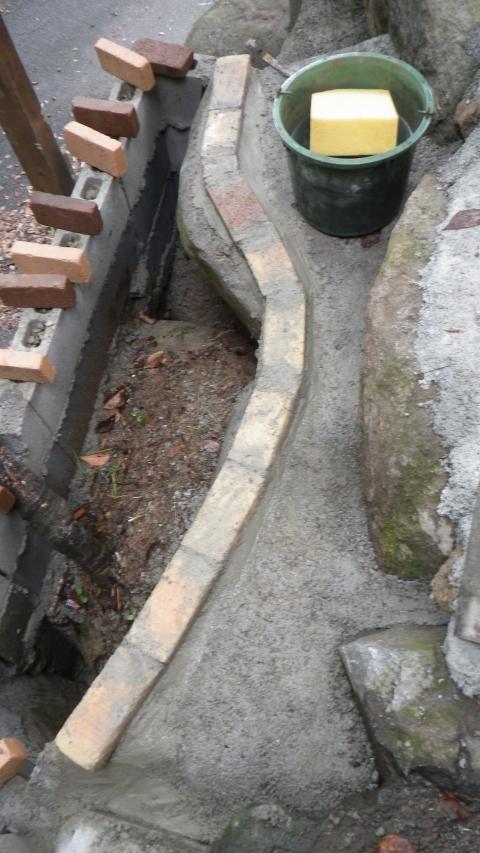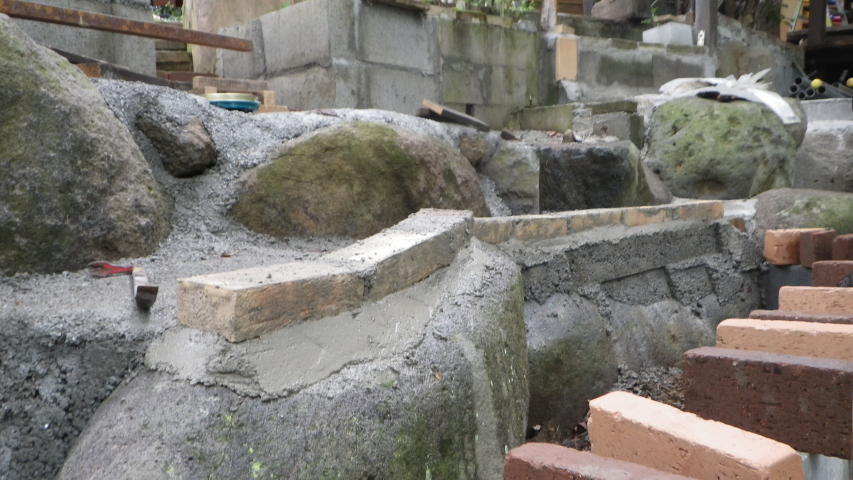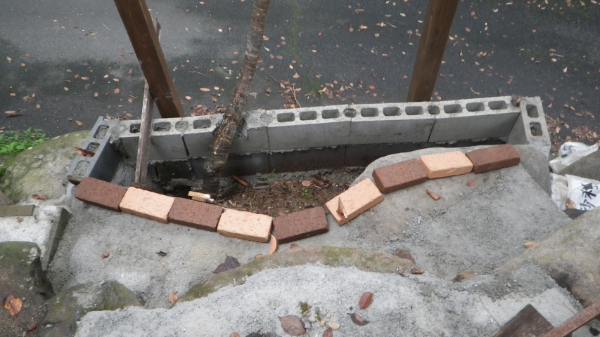 花壇上側のレンガをモルタルで固定してから、階段の嵩上げや、壁面のブロック足し等