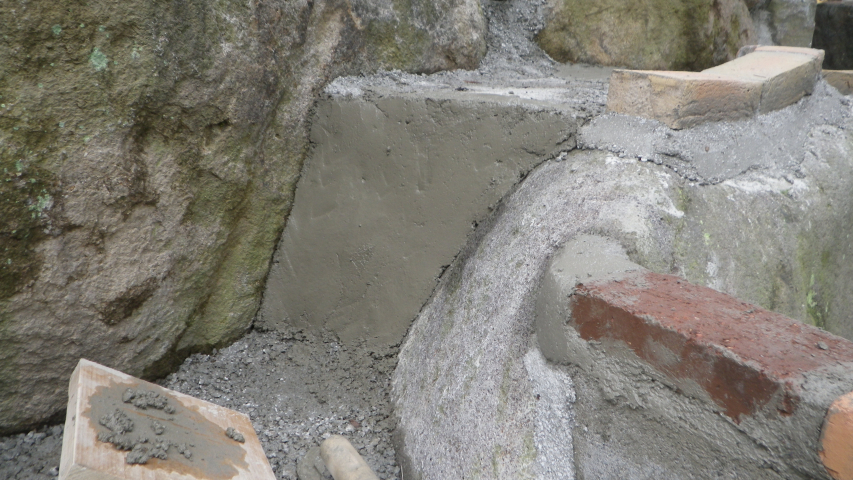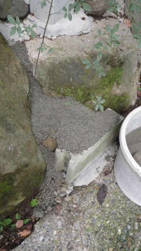 モルタルに砂利足してコンクリ化して、階段下部を埋めていく