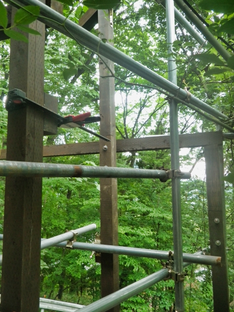 最近、雨続きで、少し柔らかくなってると思うので、単管突っ込んで、この倒れてる木を持ち上げる。 |