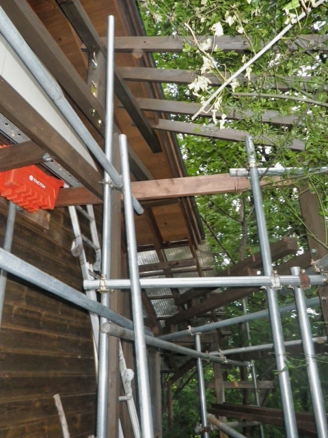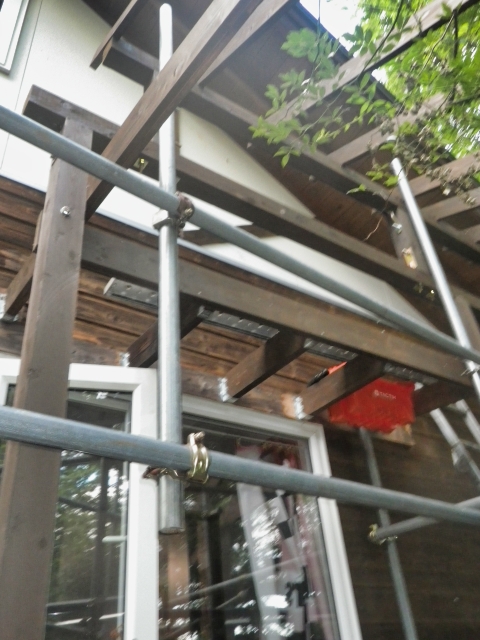 2024/8/1:パーゴラの西側の屋根の桟木と屋根張りのため足場の位置替えと追加