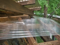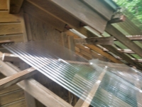朽ちた桟木の補強と、他の大屋根の延長軒先の南端の桟木の端に雨が当たらないように、ここのブラウンのポリカ波板を古い解体材で10cmほど延長する |