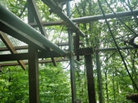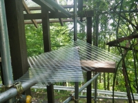 8/14:パーゴラ東側の屋根のポリカ波板張り完了 屋根張り完了したので、デッキ張り分を残して、足場の解体 旧X区のデッキが崩落しないように支えの足場を立てる