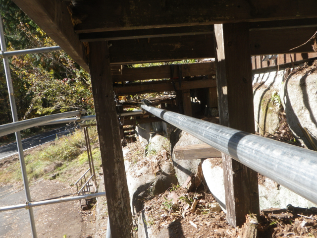 西端を抜くと次の工区の中央が崩落してしまうので、単管位置替えして中央の生きてる桁を支える |