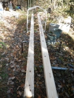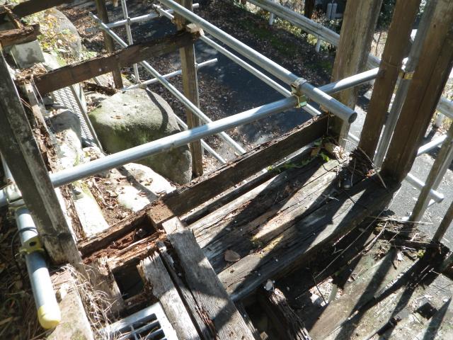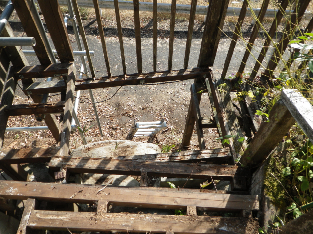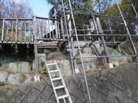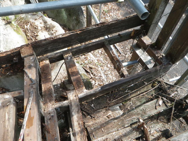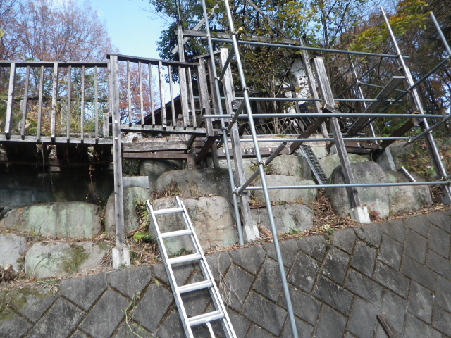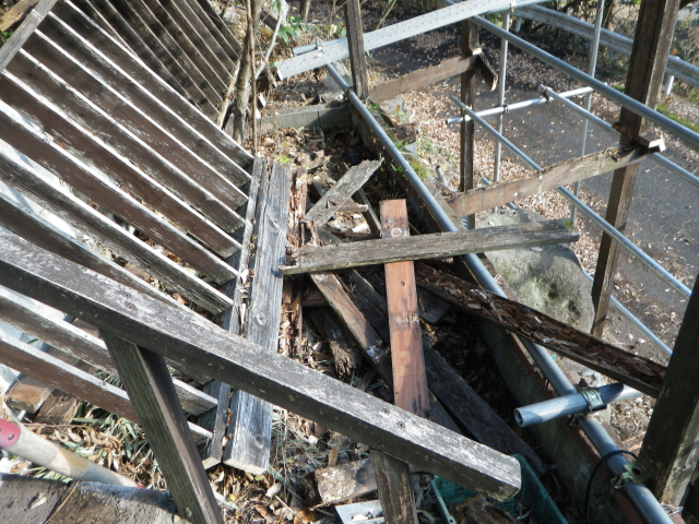 次は支柱を抜き替えて、デッキ張りだが、デッキ張ってしまうと次の工区の一段下の中央部分の解体しにくくなりそうなので、先に中央部分を解体する。 |