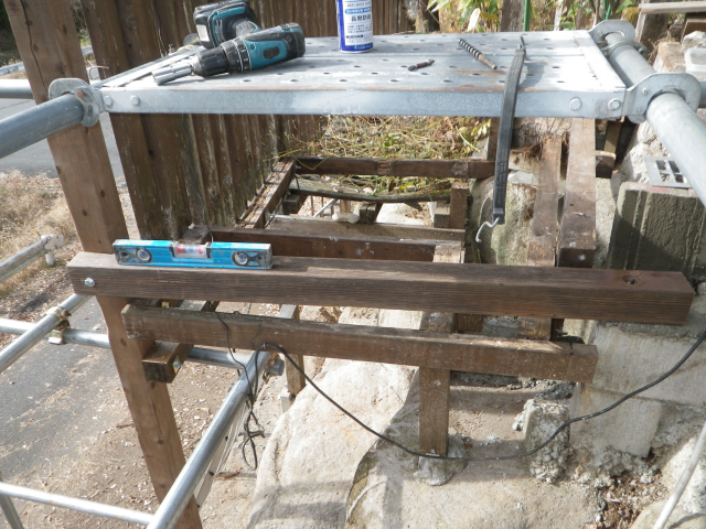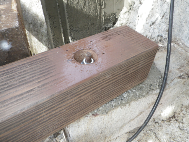 旧コンクリ基礎から出てるボルトを再利用するが、レベル合わせで2cm盛ったので、