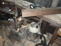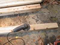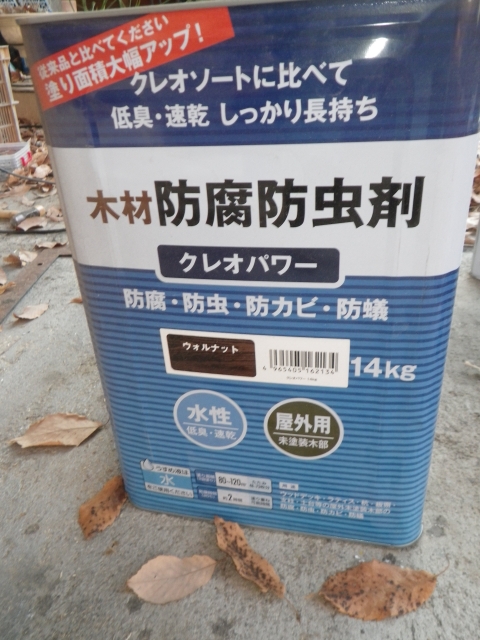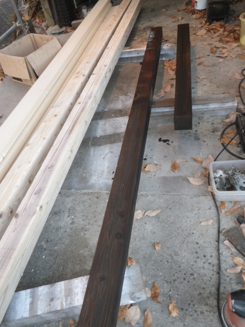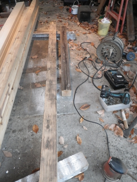 | 撤去した旧支柱(90mm角)から腐食部分を切り落とした再生材と購入した90mm角バタ材を塗装 |