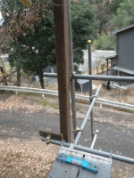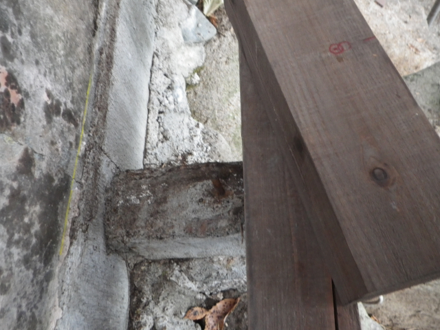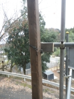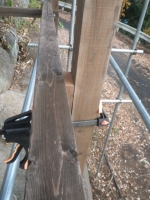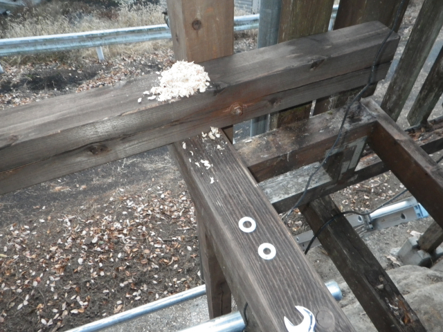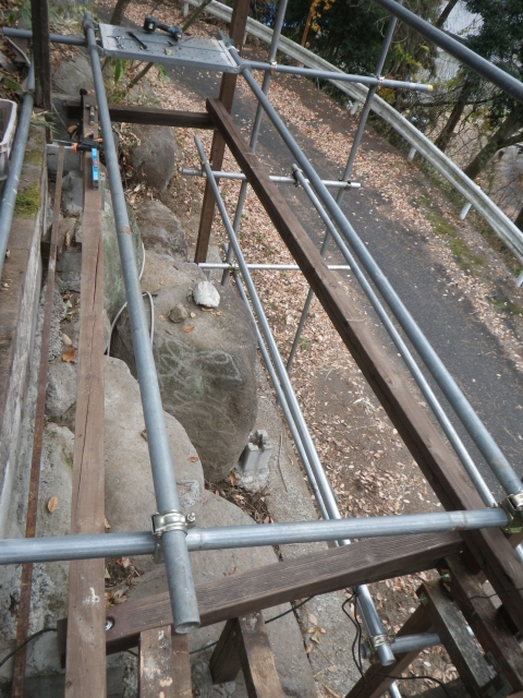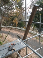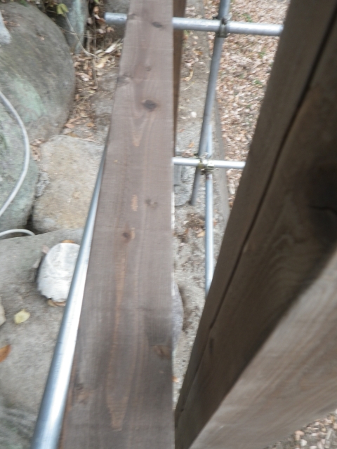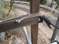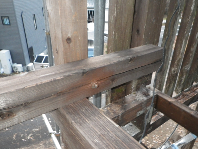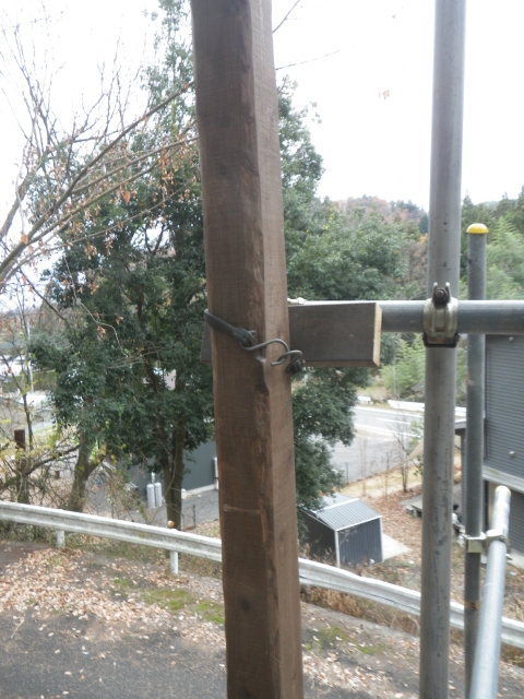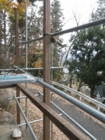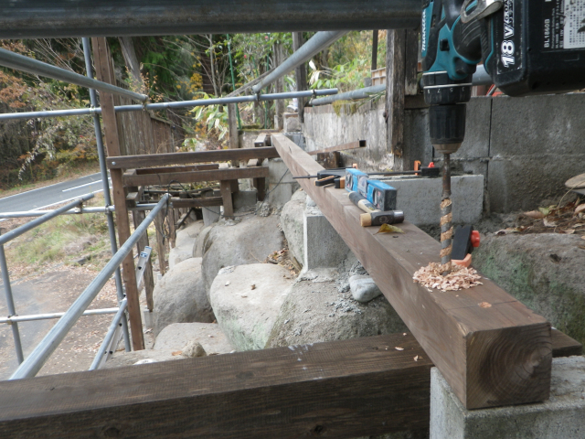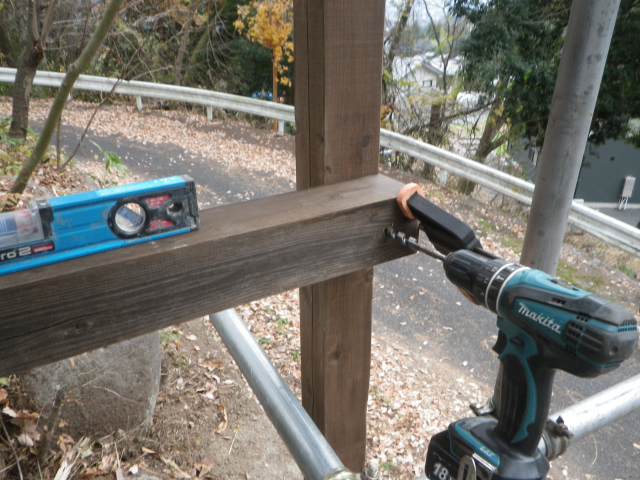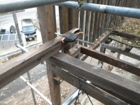 昨日、沓石をモルタルで固定しなおした東側の支柱立てて、桁取付