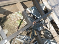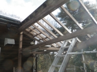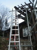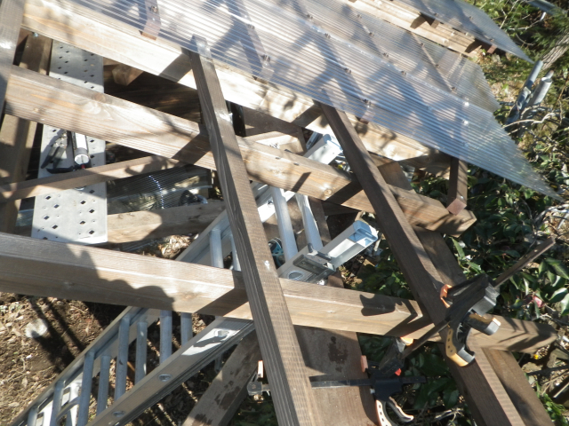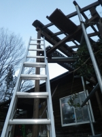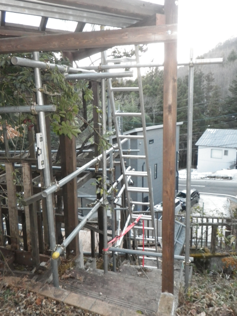 西端のポリカ屋根は、屋根の桁梁内から留められないので、梯子掛けたけど、不安定なので、新たに足場組み。