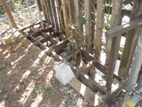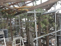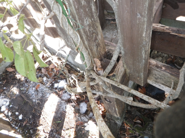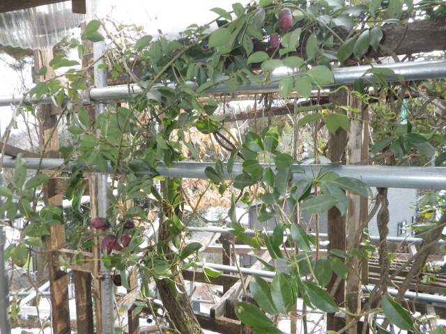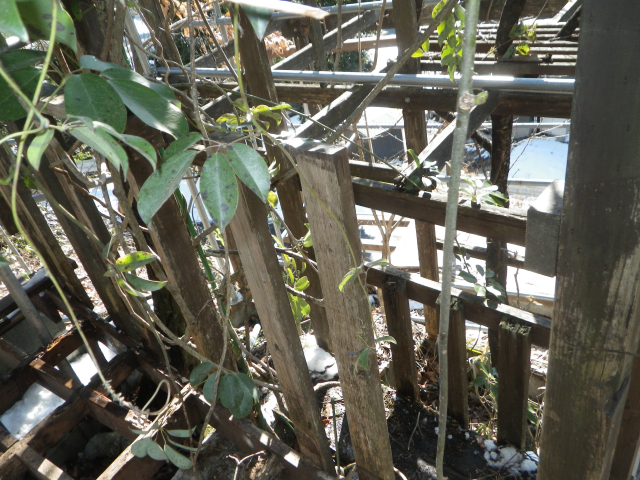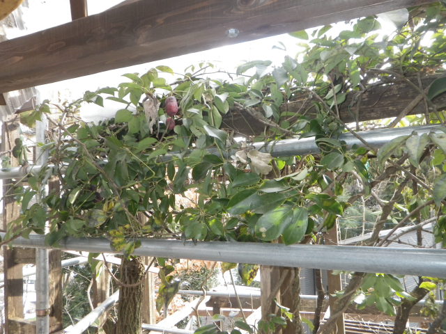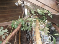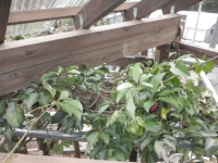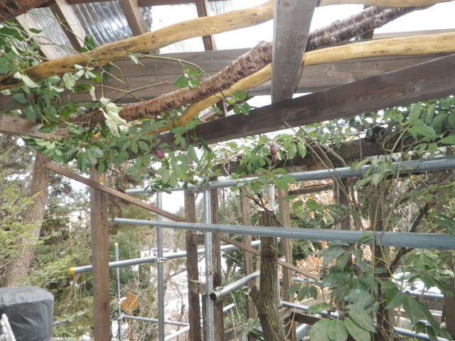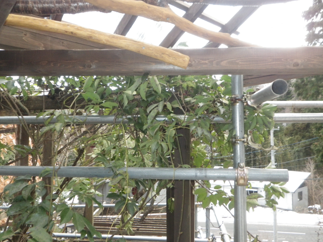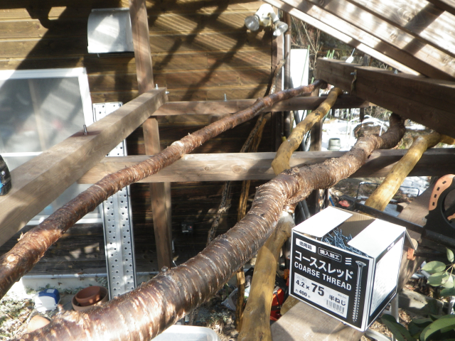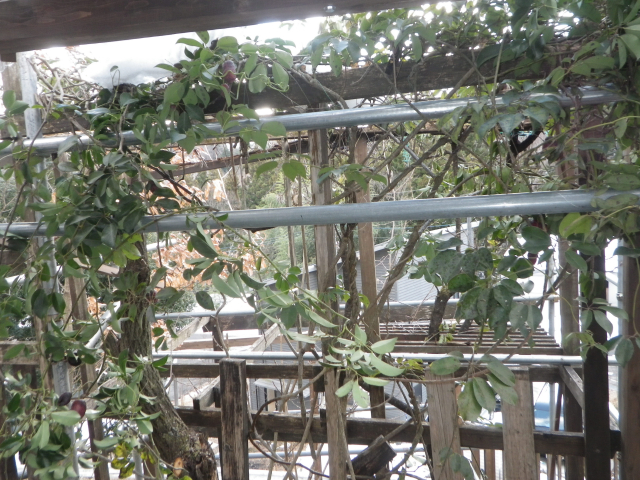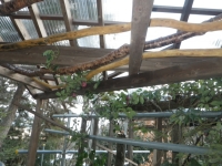 新パーゴラの天然木桁の取付完了し、大実ムベの誘引開始