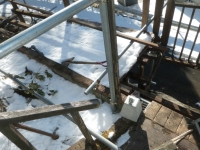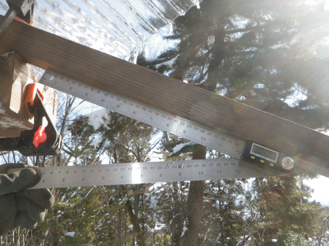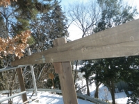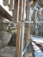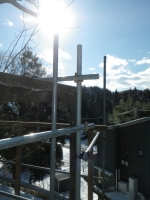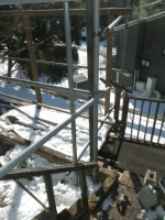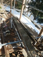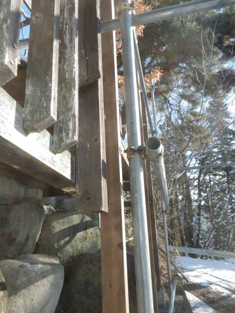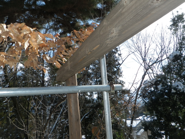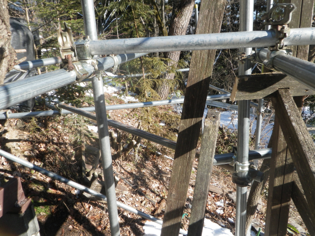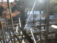 中段東側の屋根の先の下段の屋根角を中段の26°以上にするために、下段の道路側の梁を10cm下げることにして、足場の組み替えから