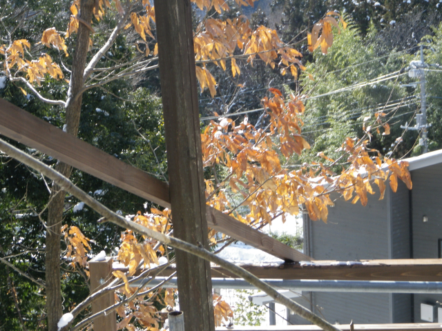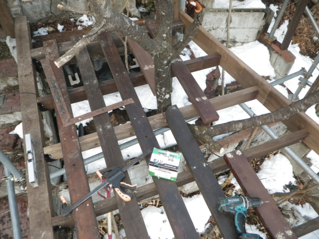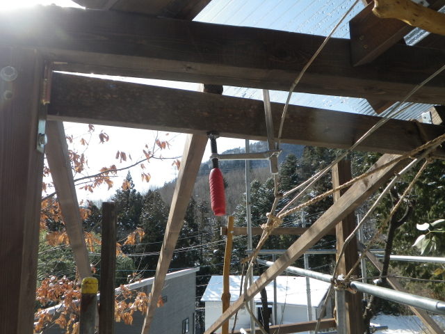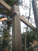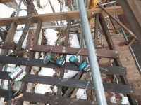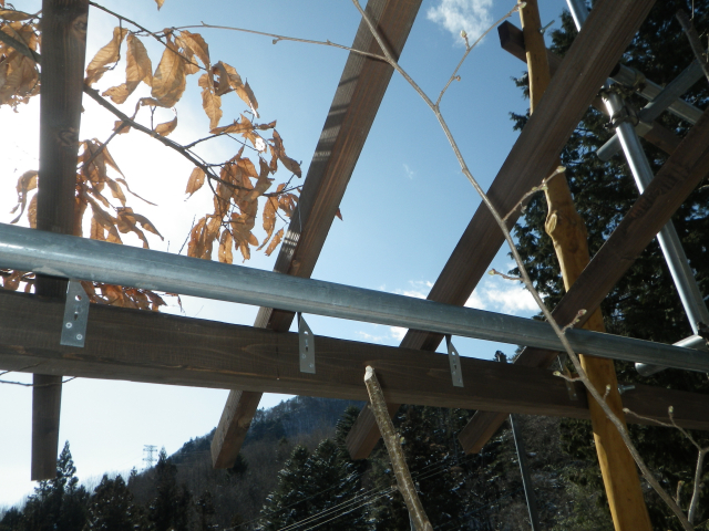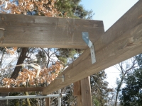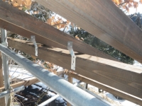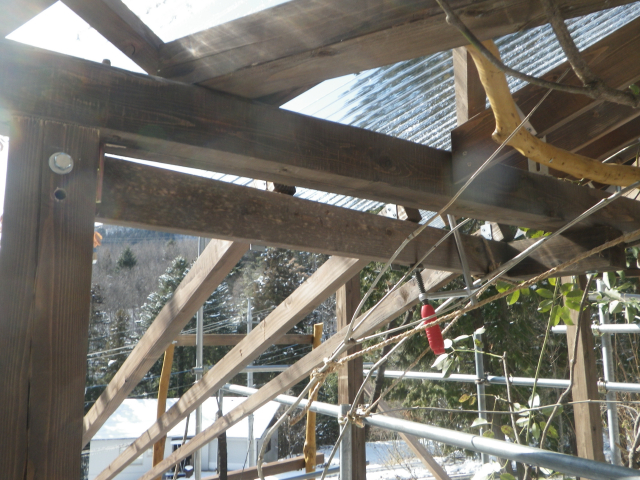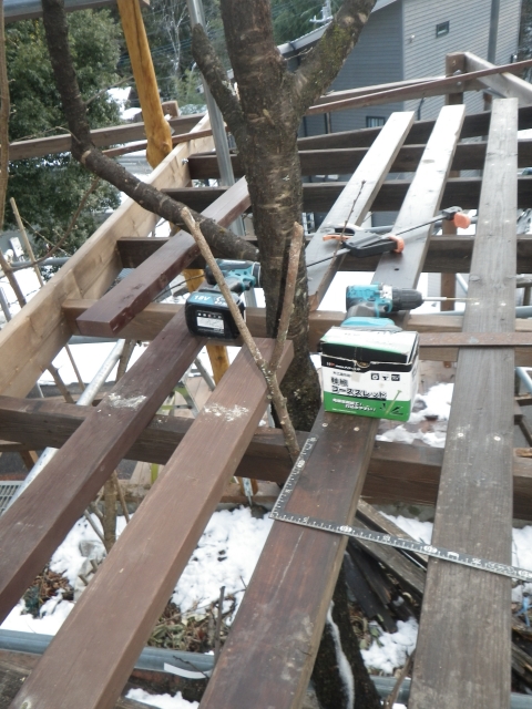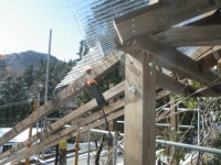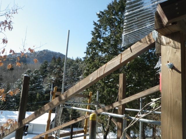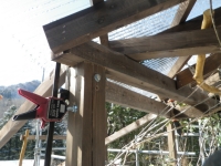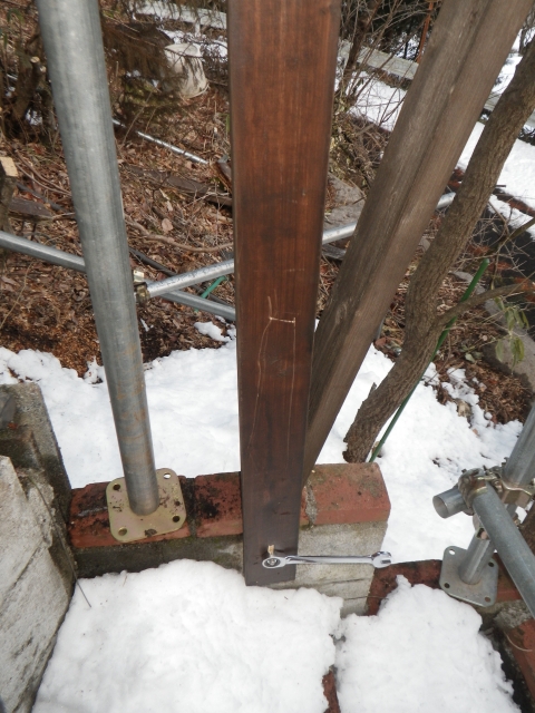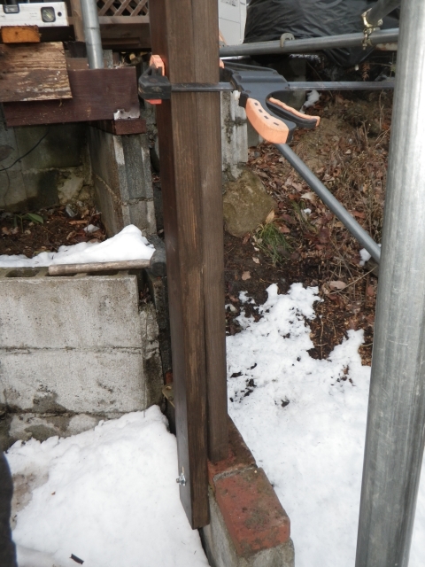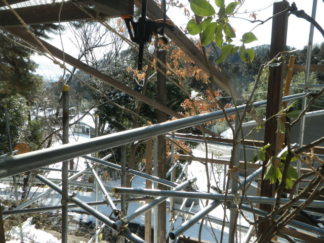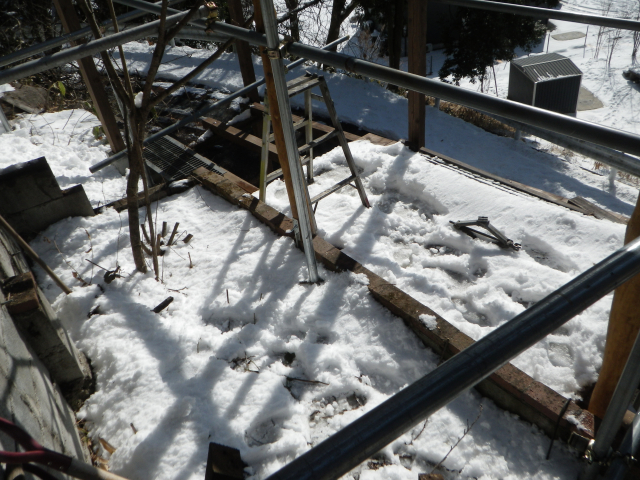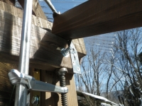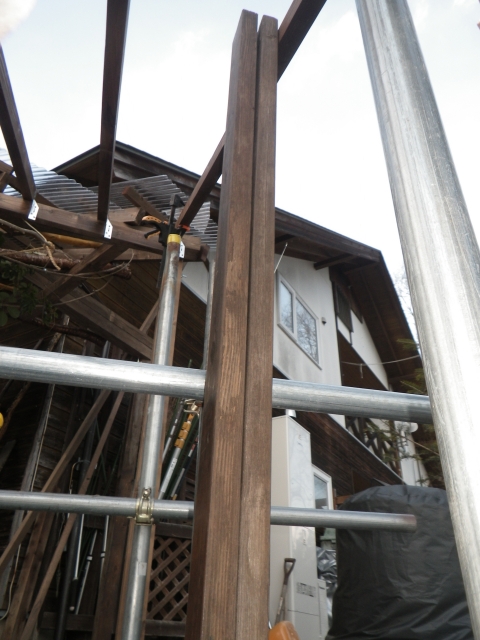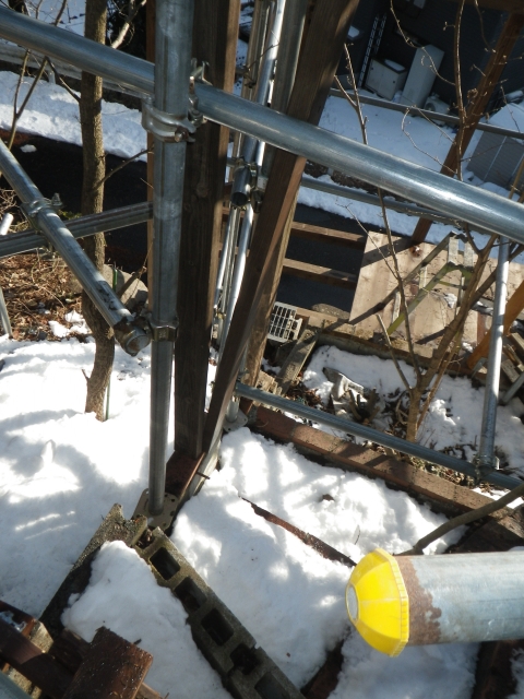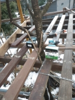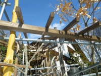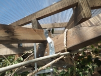 | 次は、中段東側の屋根垂木の中間部分を支える支柱を、旧桃パーゴラ支柱と同位置に旧ボルトから立ち上げる |