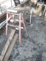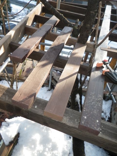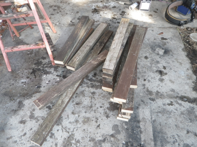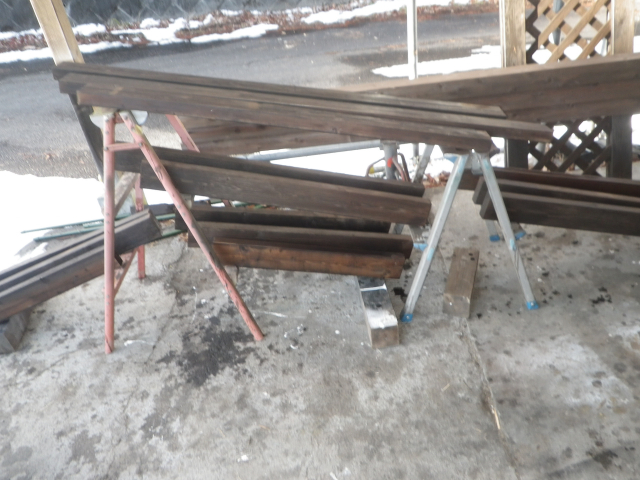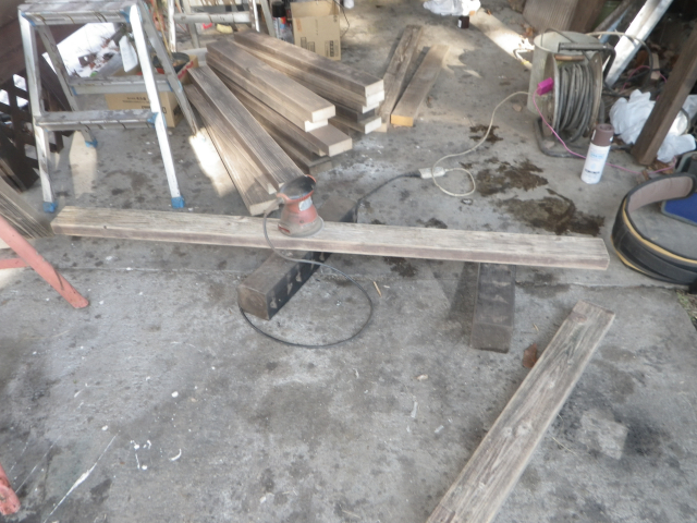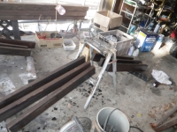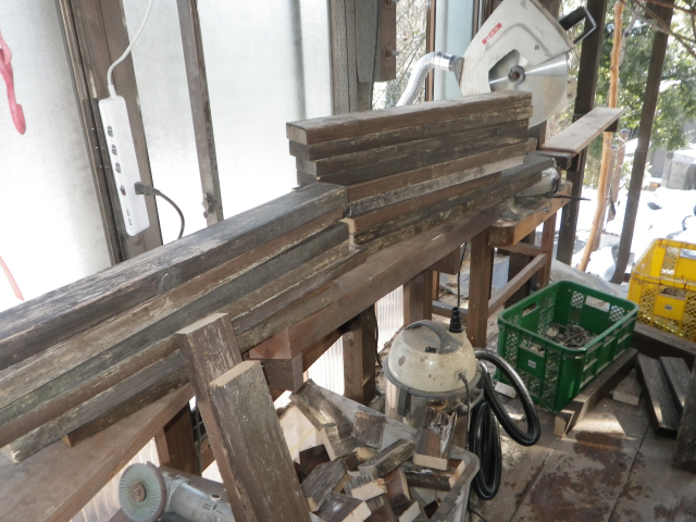 | 次は、解体材の再生の続き。大きなひび割れのない材の腐ってる部分を切り落として、研磨して塗装。 |