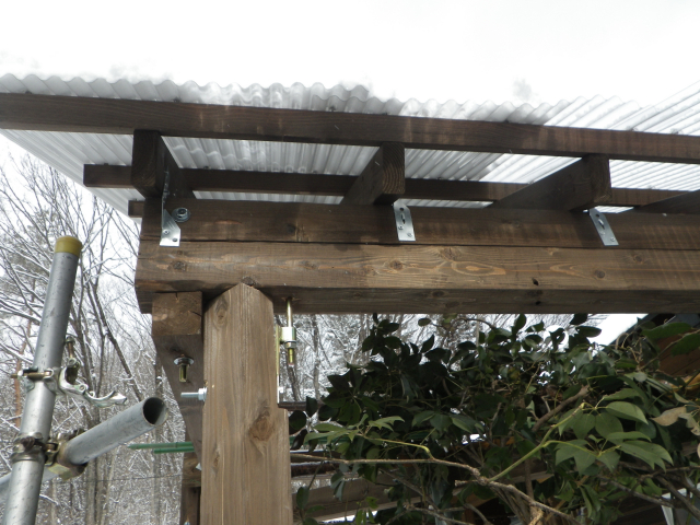 桃を囲う部屋の屋根の垂木取付用の桁の取付