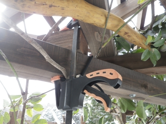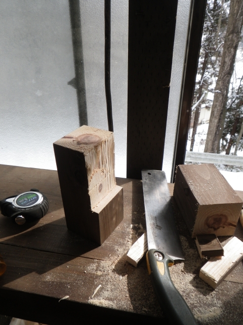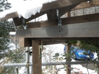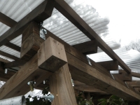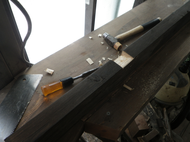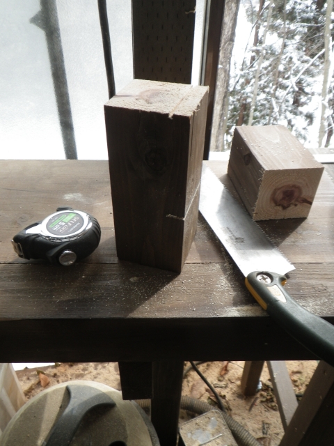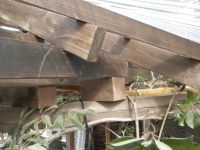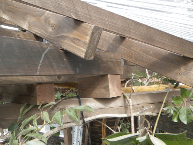 桃を囲う部屋の屋根の垂木取付用の桁を取り付けるために、支えの部材を切り出し