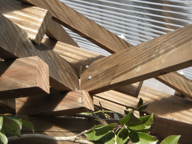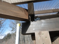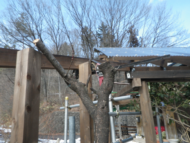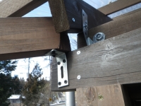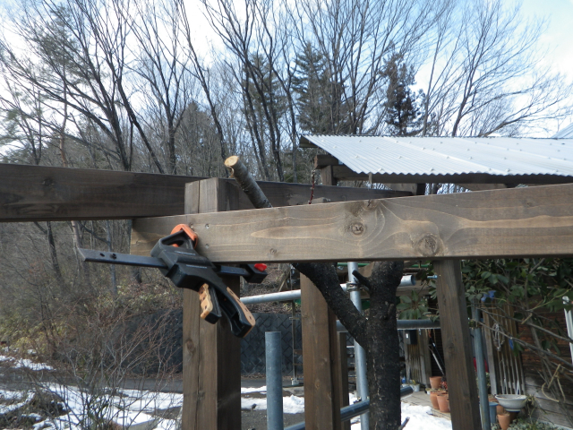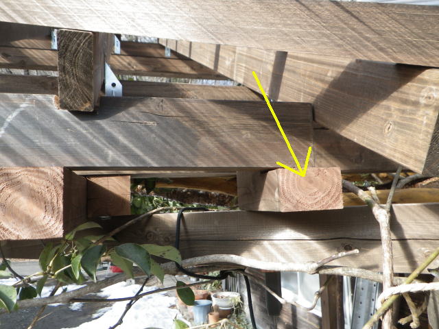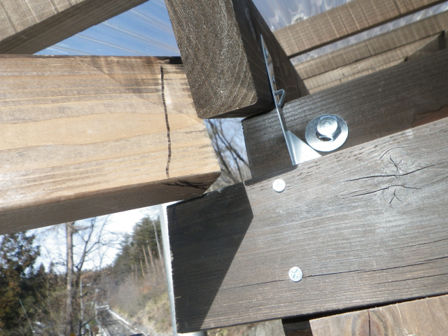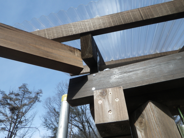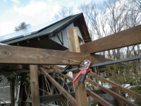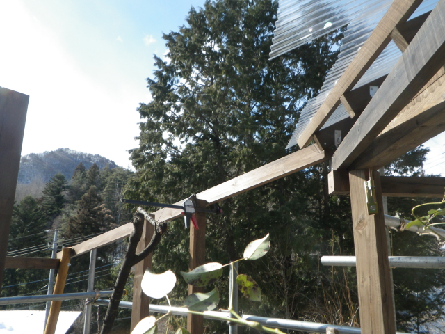 | 桃を囲う部屋の屋根は、斜度が低いので、雪が長時間滞留する想定で、垂木は、2x4材を5本使う。 |